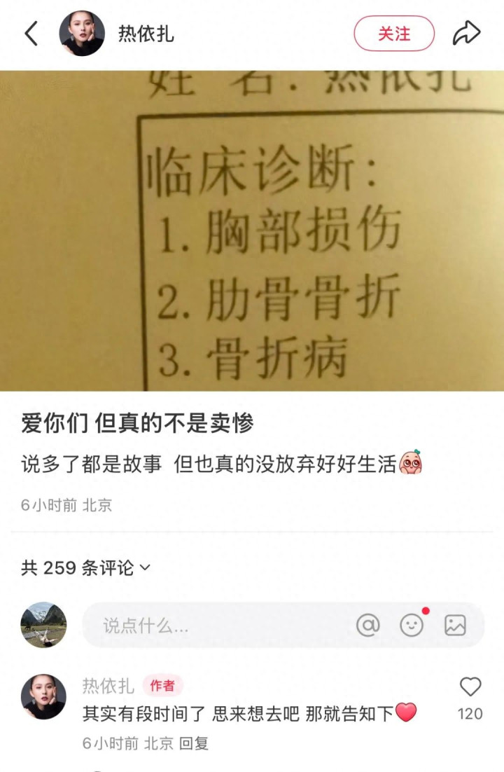 热依扎晒出的病例显示,她的临床诊断结果是:1.胸部损伤;2.肋骨骨折;3.骨折病。